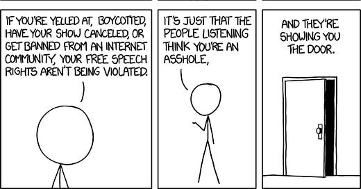 There's a popular XKCD cartoon which suggests that private corporations banning troublemakers is no different from, say, a restaurant asking you to leave because you're making a scene.